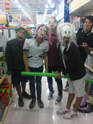 Well we then saw Halloween masks and decided to wear it on. Took some photo's with it. Oh after that, we still used it on and scared people. LOL. We hid and scared people out of their wits! hahahahahahahahhahahahahahaha, the look on their face was priceless. Well, Slimy tried to scare this little boy. EPIC FAILURE. Instead the little kid was laughing and smiling. Thing is, when Slimy opened his mask, the little kid wasnt smiling and ran to his dad's leg and hugged it. HAHAHAHA.